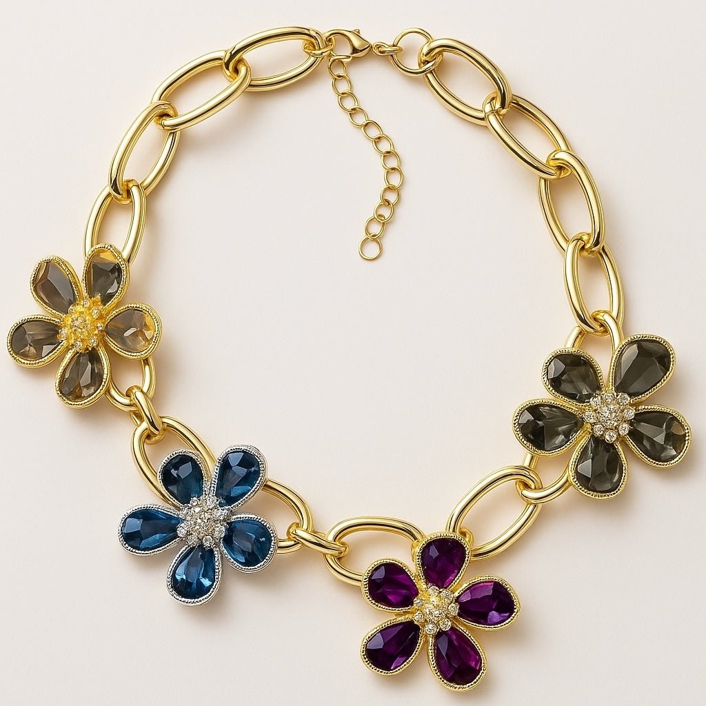This exquisite Orna Curio statement necklace showcases elegant, shimmering flowers artfully arranged on a striking gold plated chain. Make a statement with this masterpiece!